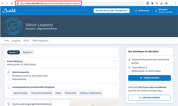 Fügen Sie in der ersten Zeile des Codes den Link zu Ihrem Doctolib Profil ein. Gehen Sie dafür auf www.doctolib.de und geben Sie in der Suche Ihren Namen oder den Namen Ihrer Praxis ein. Klicken Sie dann auf das Profil und kopieren Sie die URL, die Sie oben in Ihrem Browser sehen (hier rot umrandet) und fügen sie Sie in dem Code anstatt der XXX in der ersten Zeile ein.